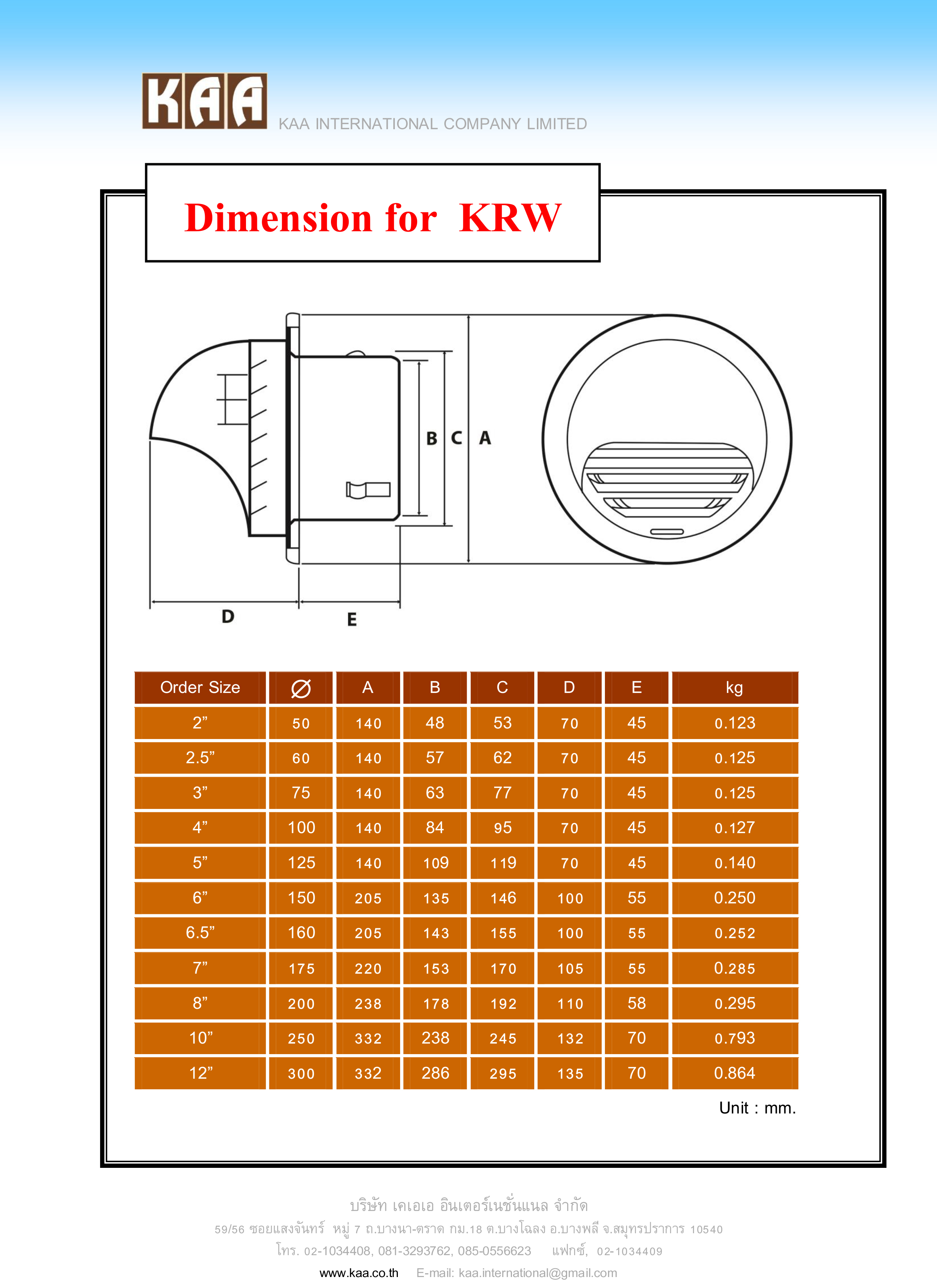 | STANDARD VERSIONS | KRW 50 SS KRW 75 SS KRW 100 SS KRW 125 SS KRW 150 SS KRW 200 SS KRW 240 SS KRW 250 SS KRW 280 SS KRW 300 SS | 100 mm. (2 นิ้ว) 125 mm. (3 นิ้ว) 100 mm. (4 นิ้ว) 125 mm. (5 นิ้ว) 150 mm. (6 นิ้ว) 100 mm. (8 นิ้ว) 125 mm. (9 นิ้ว) 100 mm. (10 นิ้ว) 125 mm. (11 นิ้ว) 125 mm. (12นิ้ว) |
