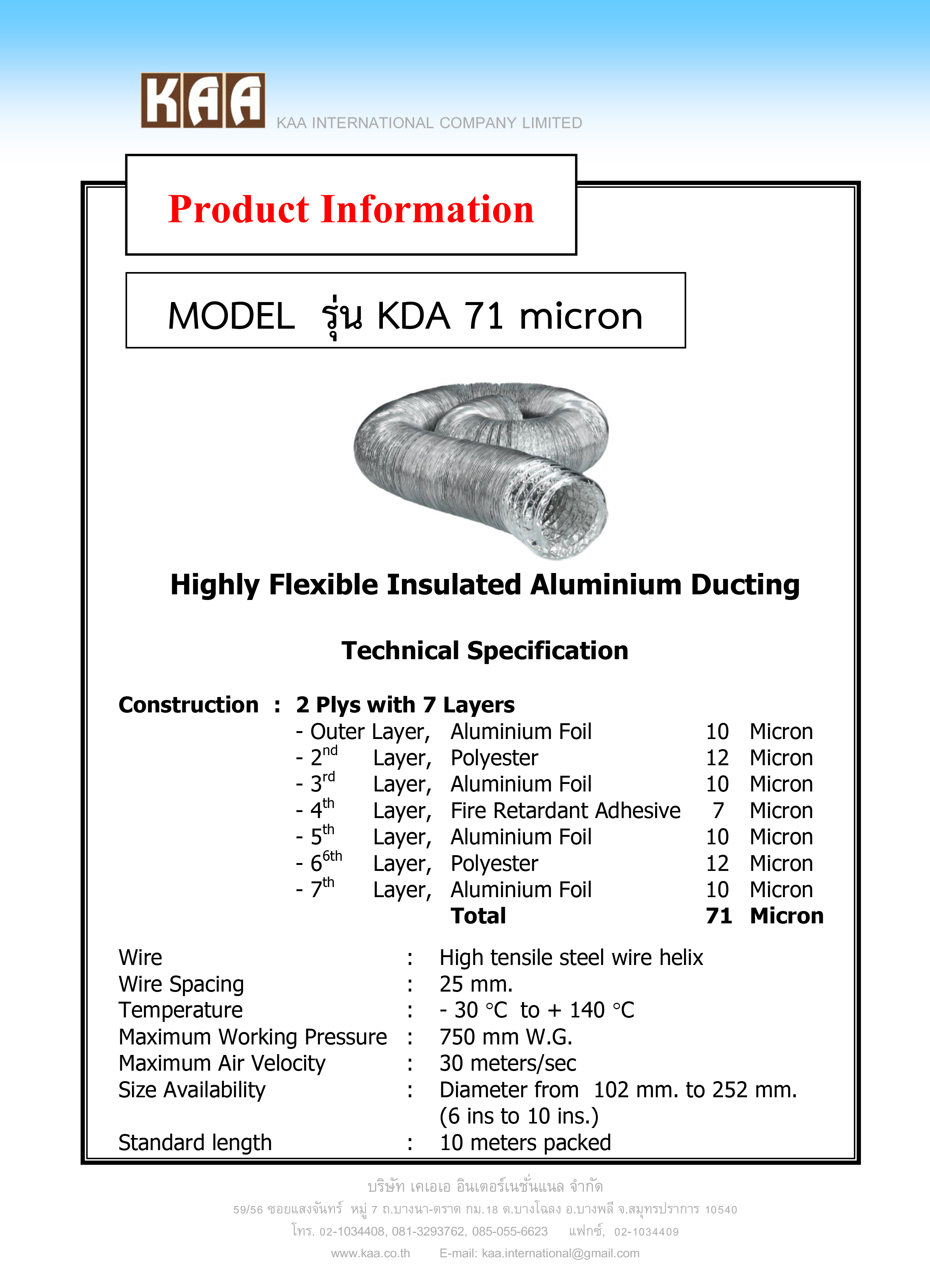 ท่อนำอากาศ ท่อเฟล็ก (FLEXIBLE DUCT) ผลิตจากอลูมิเนียมฟอล์ย/โพลีเอสเตอร์ (Aluminium / Polyester Laminated Foil) เสริมความแข็งแรงด้วยลวดสปริงชุบทองแดงกันสนิม / ระยะห่างระหว่างลวดสปริง 25 มม. ยืดหยุ่นสูง ทนทาน โค้งงอได้อย่างอิสระ น้ำหนักเบา ไม่ลามไฟ ทนต่อความร้อน ความเย็น และแรงดันลมได้สูง / มีให้เลือกหลายขนาด ตั้งแต่ขนาด 4 นิ้ว ถึง 10 นิ้ว